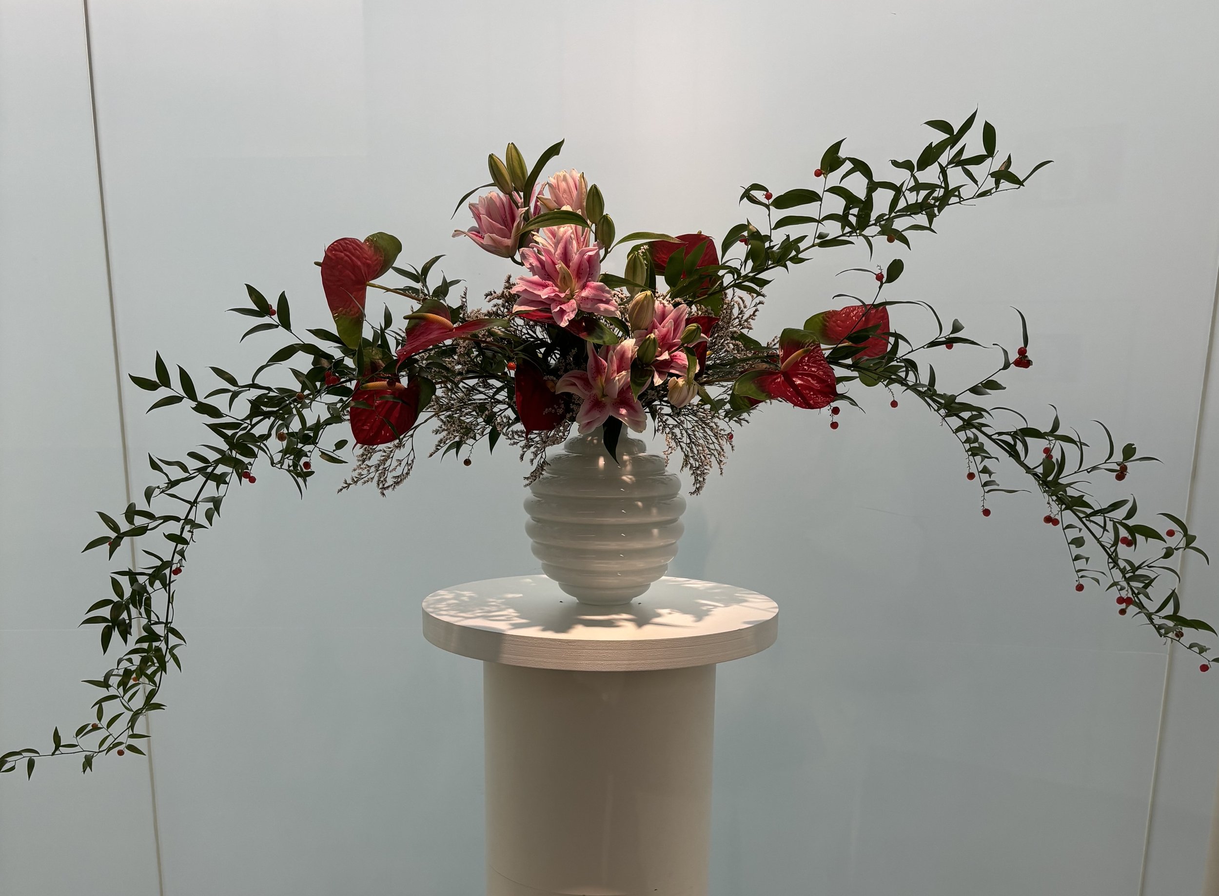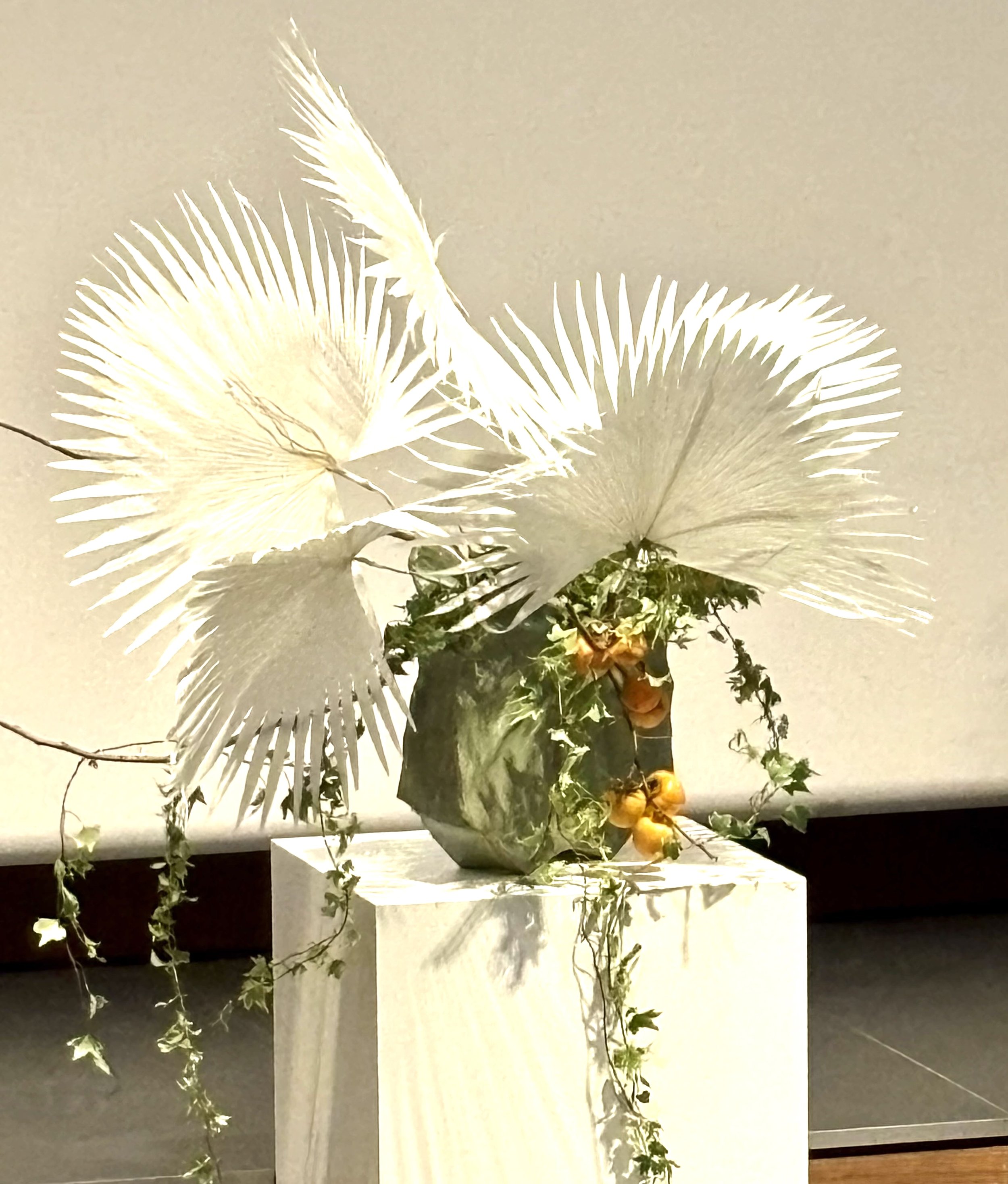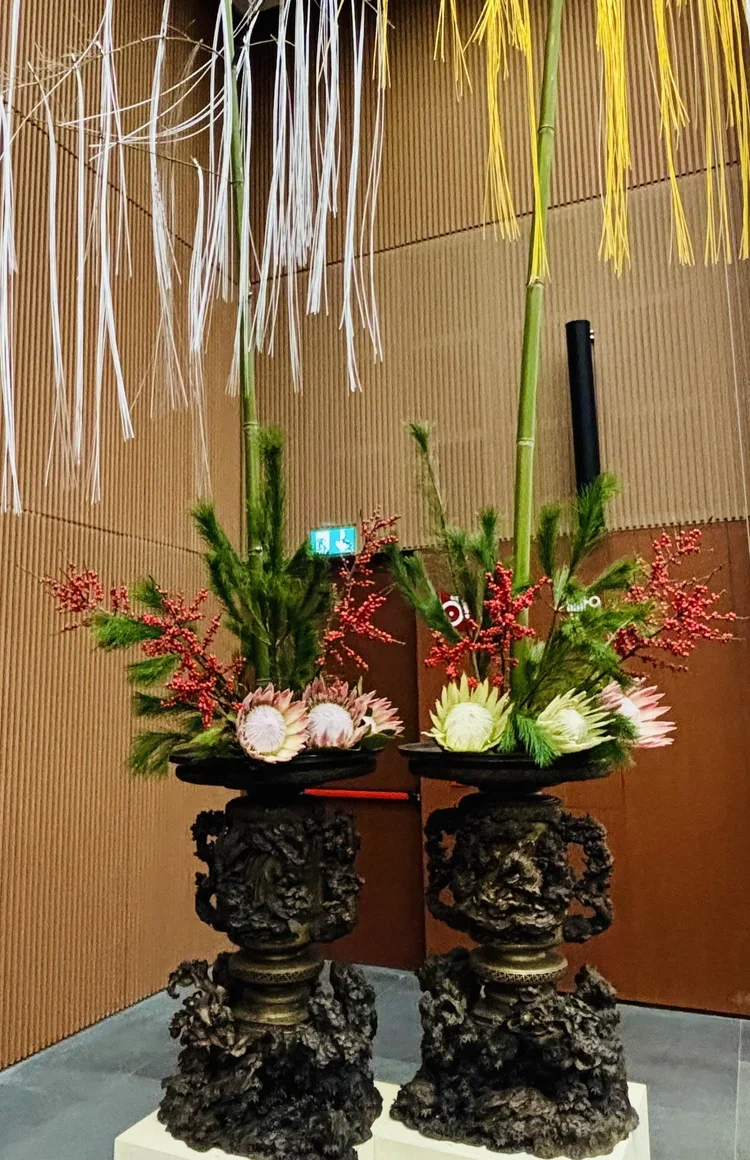 Among the other works – one of them with hydrangeas, forsythia, and branches spilling out from the sides of the vase, creating flow and movement – the final piece was imposing. In two tall, elaborately decorated bronze vases, the Master placed pine branches, red berries, yellow and pink protea, and an auspicious element consisting of a bamboo cane adorned with thin threads of silver and gold paper, typical of certain Japanese celebrations. The powerful elegance of this work enchanted the audience.