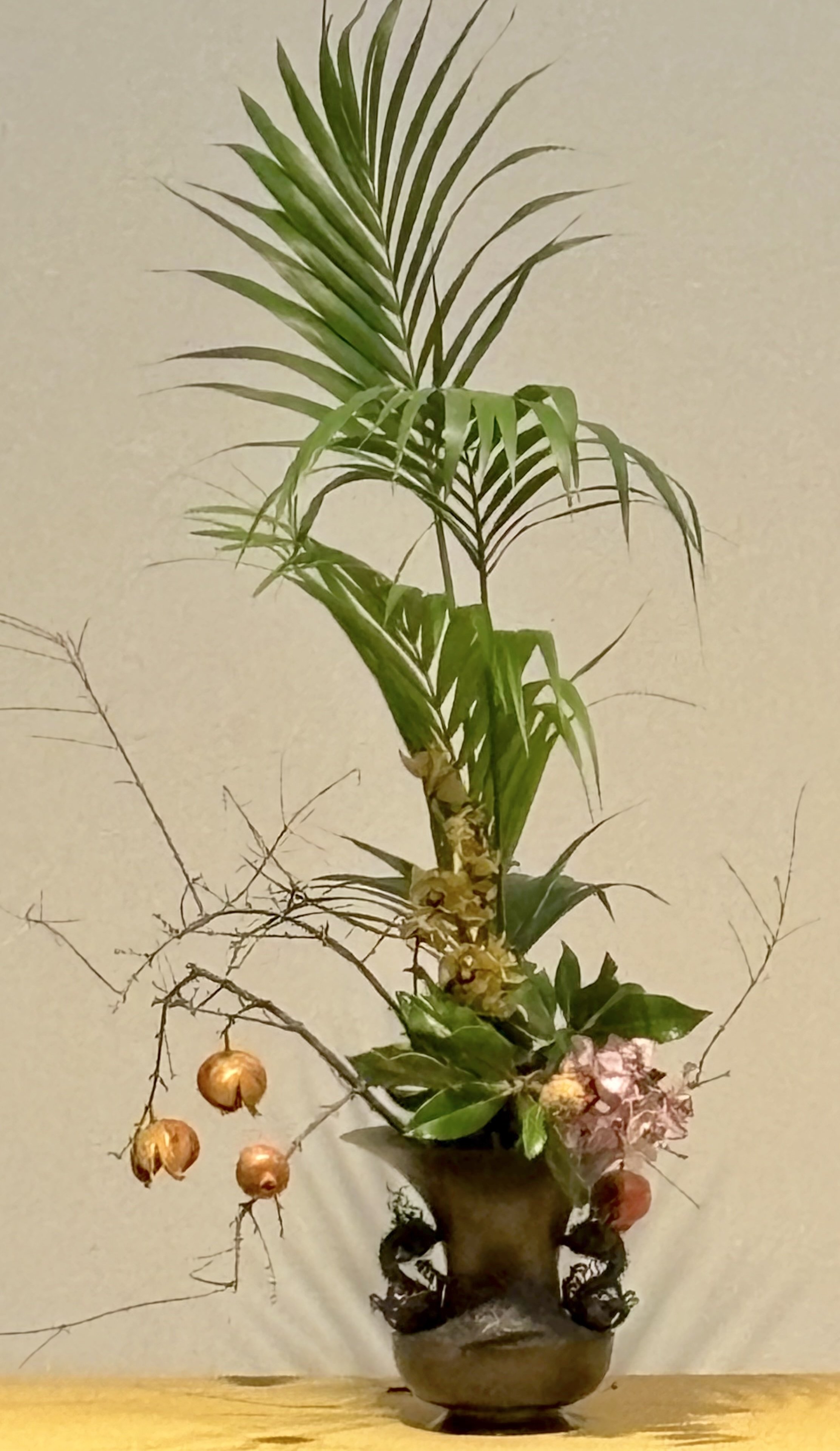 Another memorable arrangement combined two orchid branches, areca palm, seed pods, magnolia leaves, and branches with small pomegranates in a brass vase with dragon-shaped handles. The colours – green, pink, yellow and orange – intertwined gracefully.
